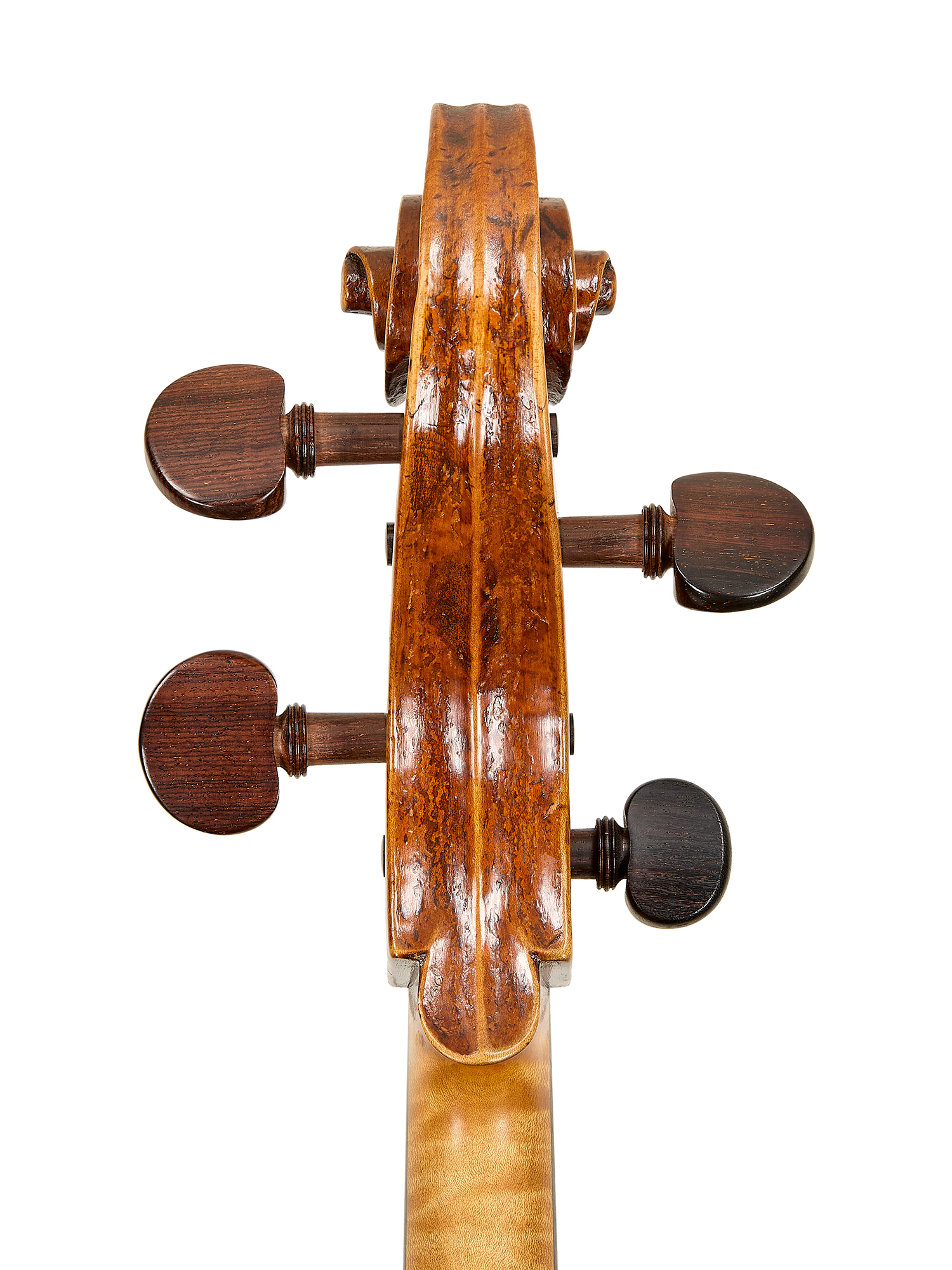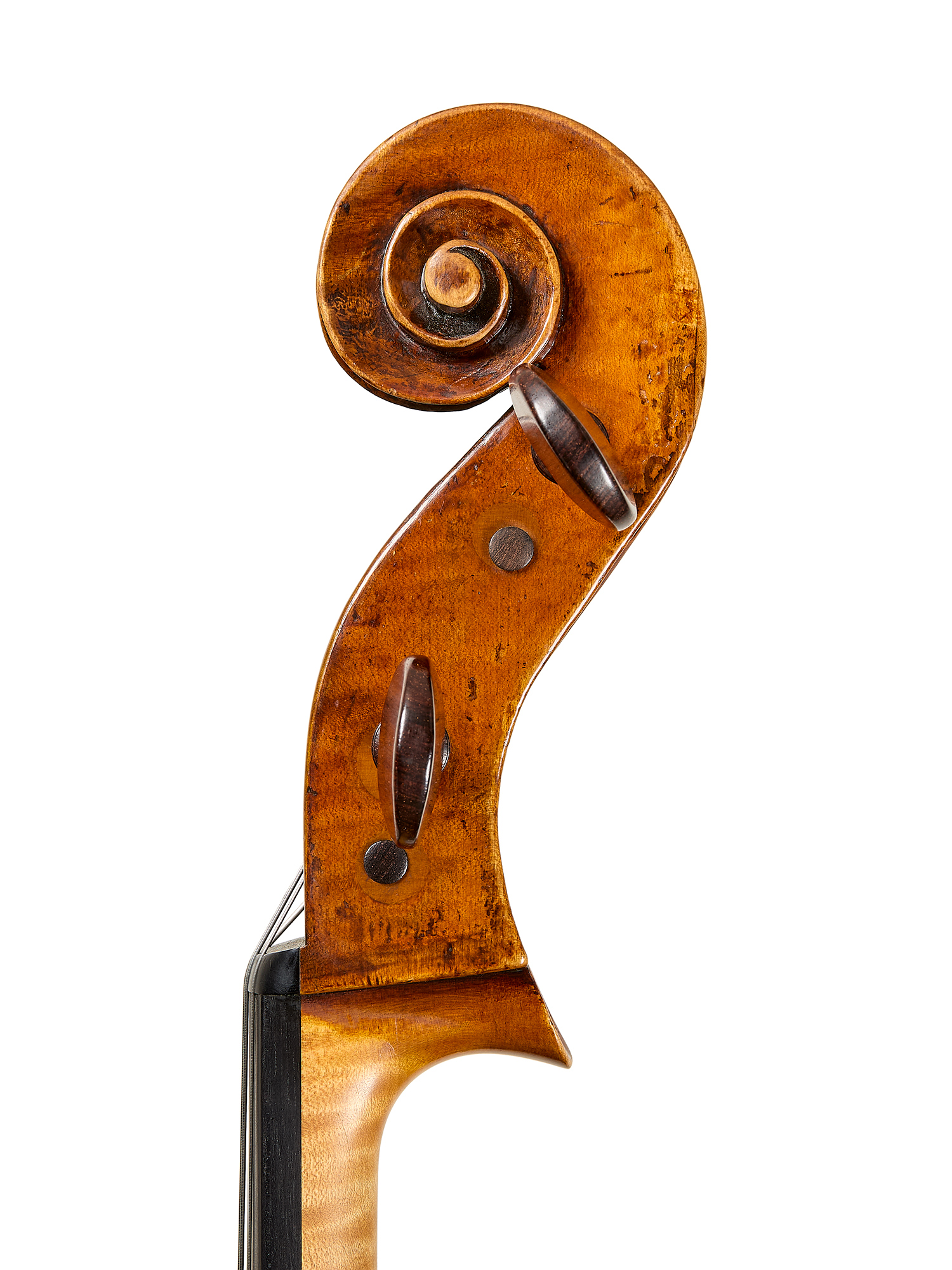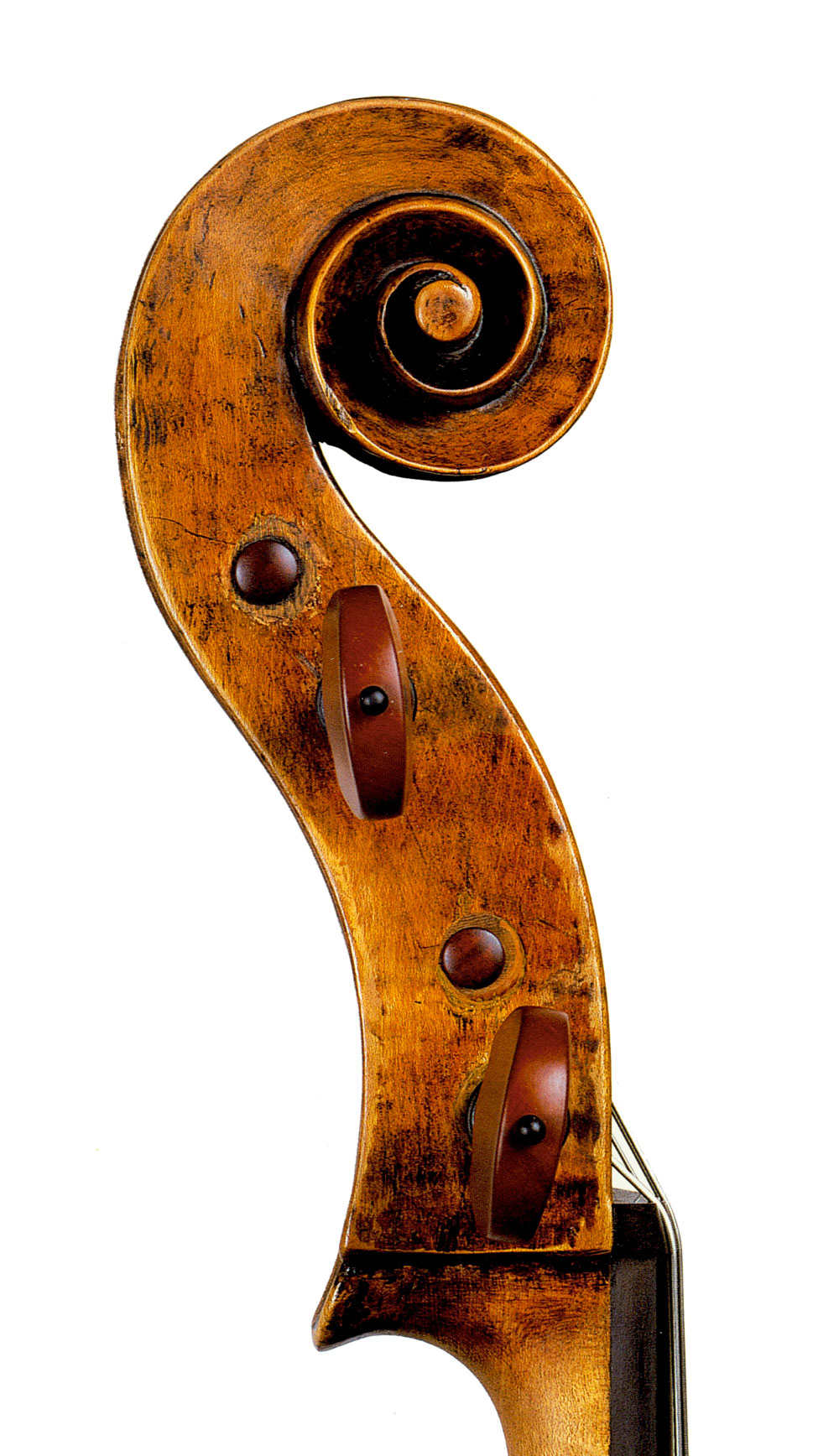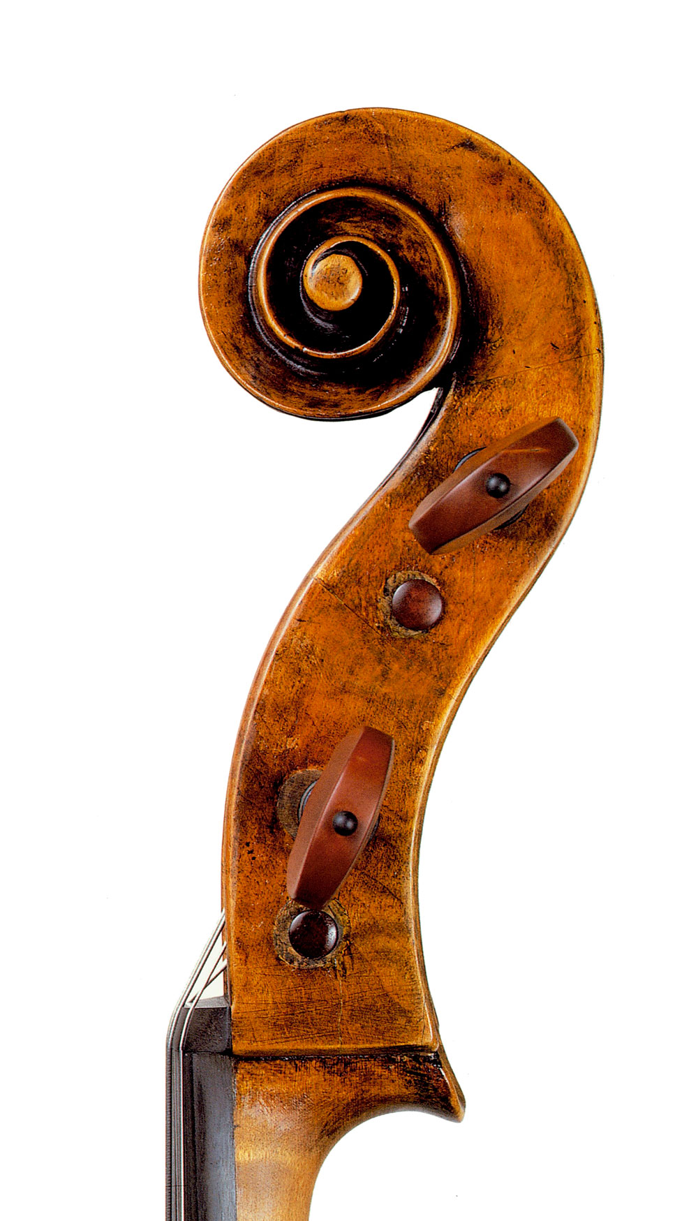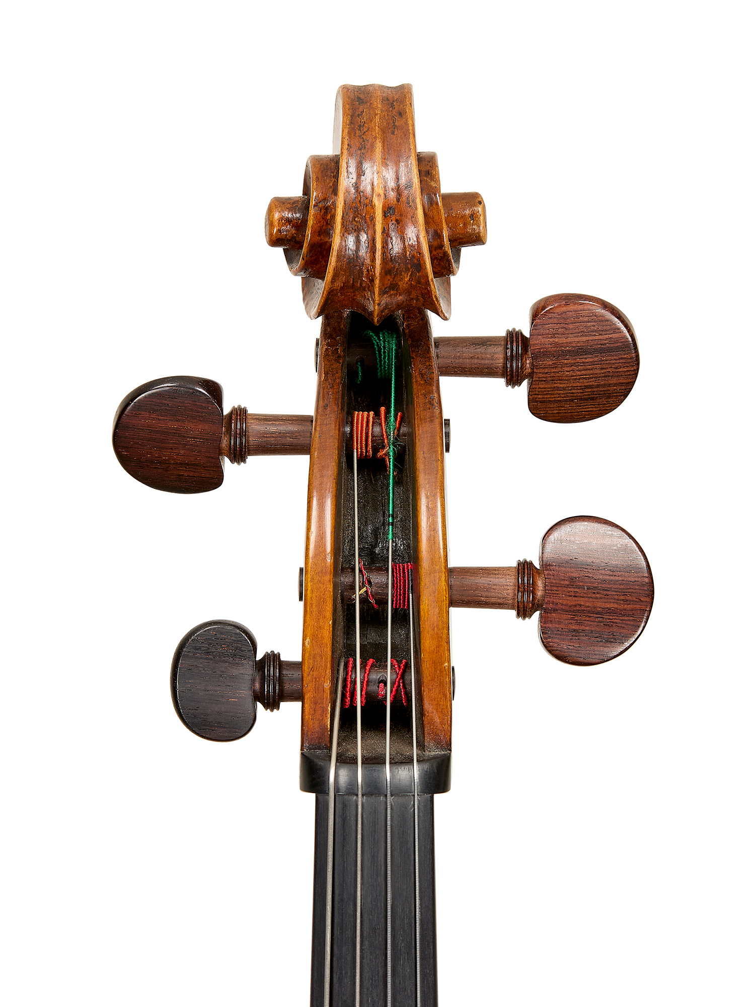 Storioni’s soundholes and scrolls are highly distinctive. As we see in this example, the soundholes are often set at a steep incline flowing gracefully into the arching and not stiff or overly symmetrical. The heads feature a long, extended pegbox with pairs of “grouped” peg holes. In a cello, the A and C pegs are grouped together, as are those of the D and G. Storioni scrolls are generally oversized with a deeply cut volute whose final turn extends beyond the usual terminus. The edges are finished with a fine chamfer but otherwise not much attempt is made to clean up toolmarks.