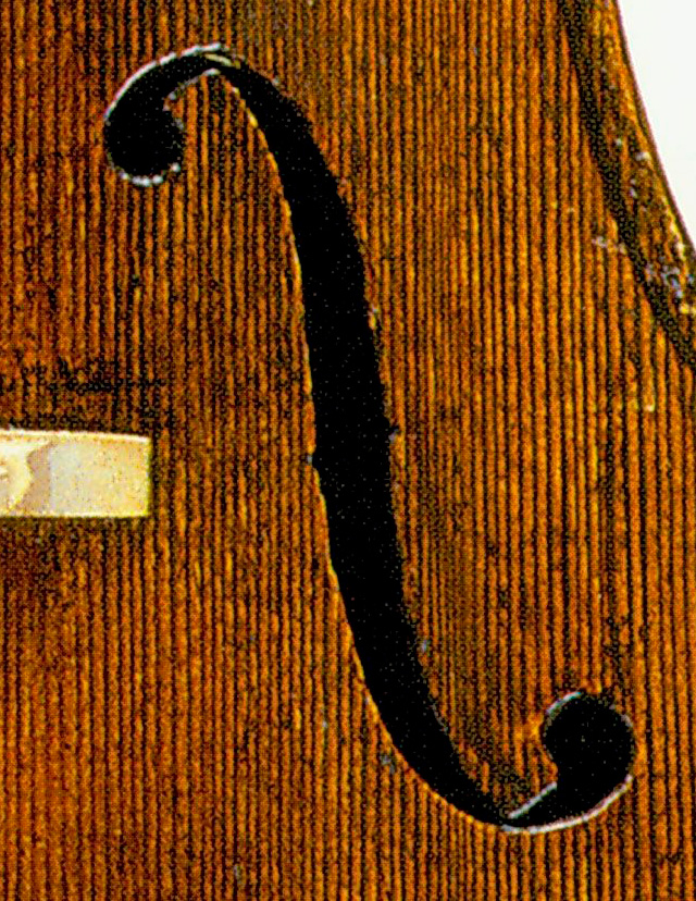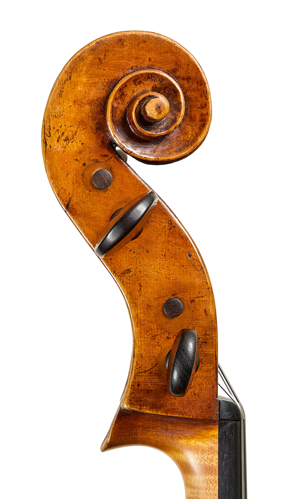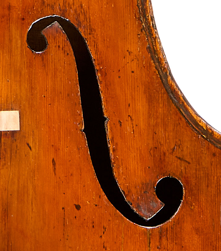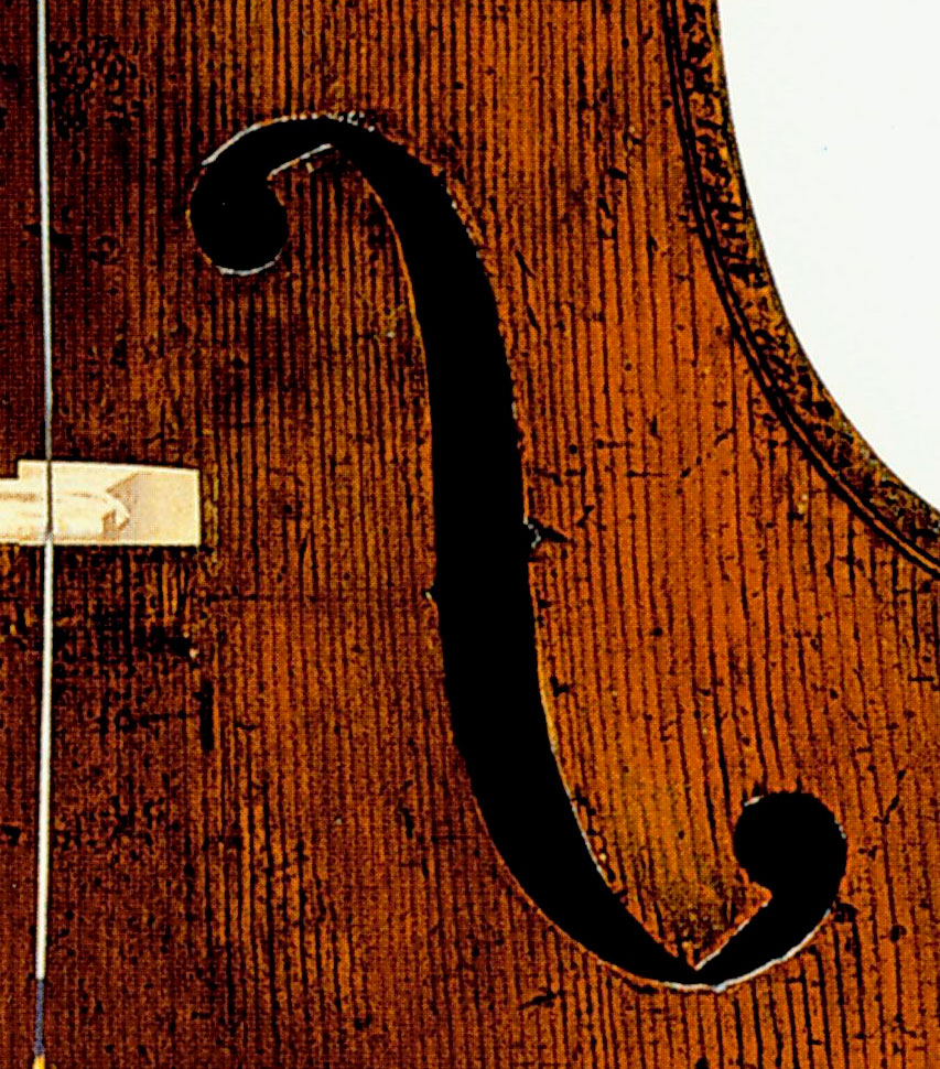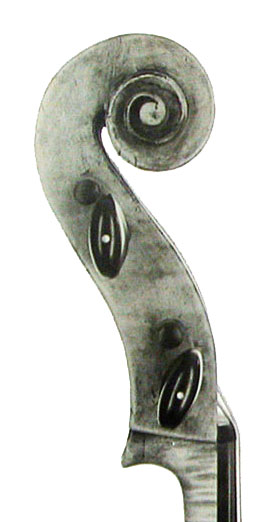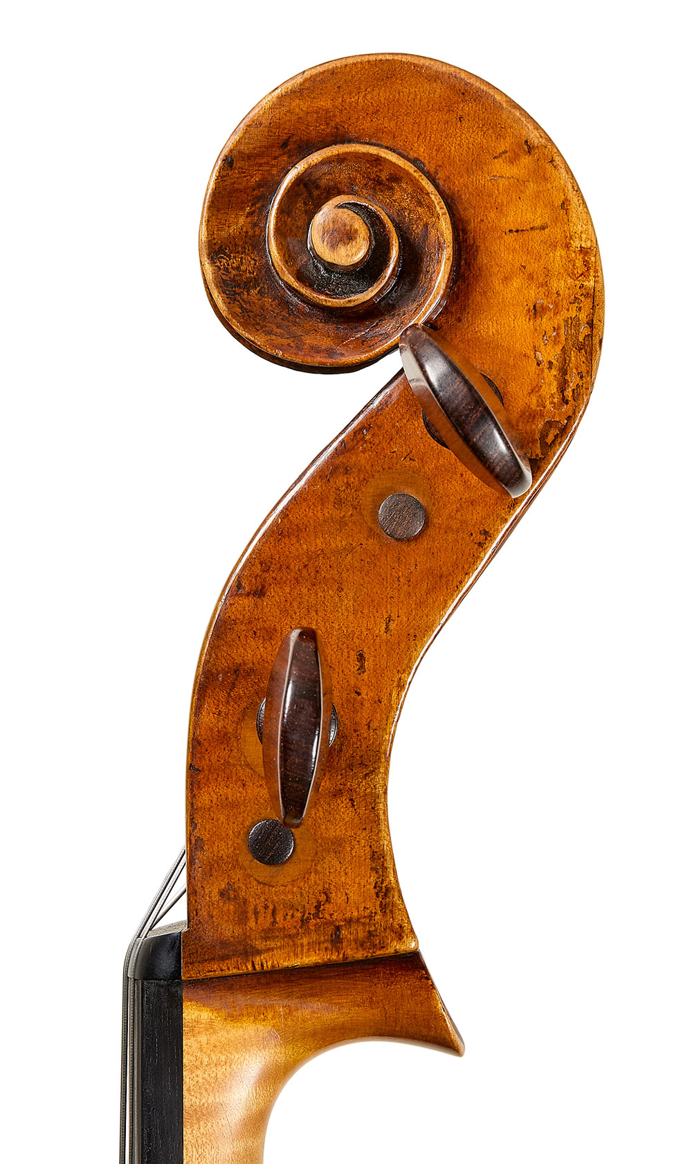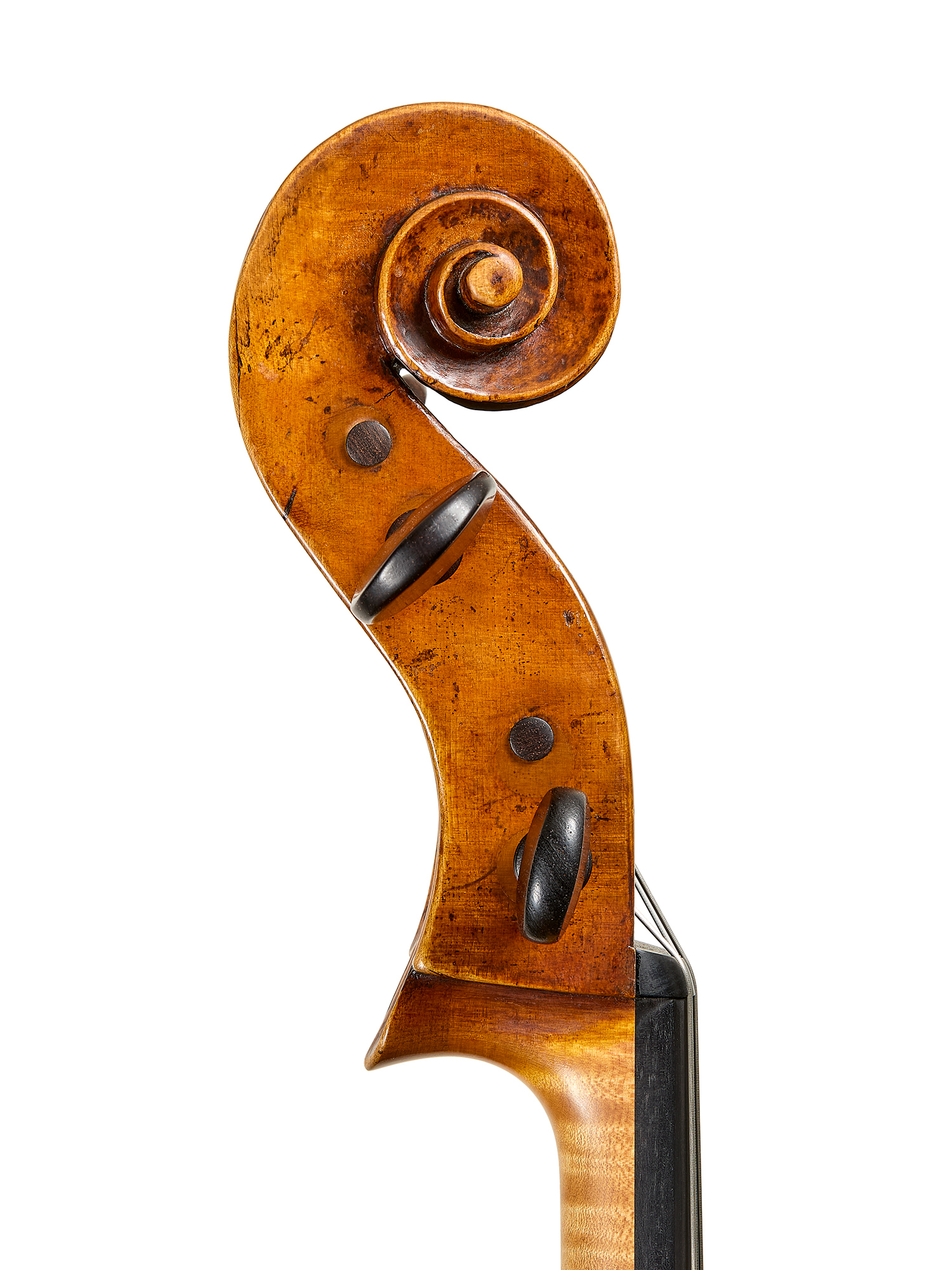 Storioni’s soundholes and scrolls are highly distinctive. As we see in this example, the soundholes are often set at a steep incline flowing gracefully into the arching and not stiff or overly symmetrical. The heads feature a long, extended pegbox with pairs of “grouped” peg holes. In a cello, the A and C pegs are grouped together, as are those of the D and G. Storioni scrolls are generally oversized with a deeply cut volute whose final turn extends beyond the usual terminus. The edges are finished with a fine chamfer but otherwise not much attempt is made to clean up toolmarks.