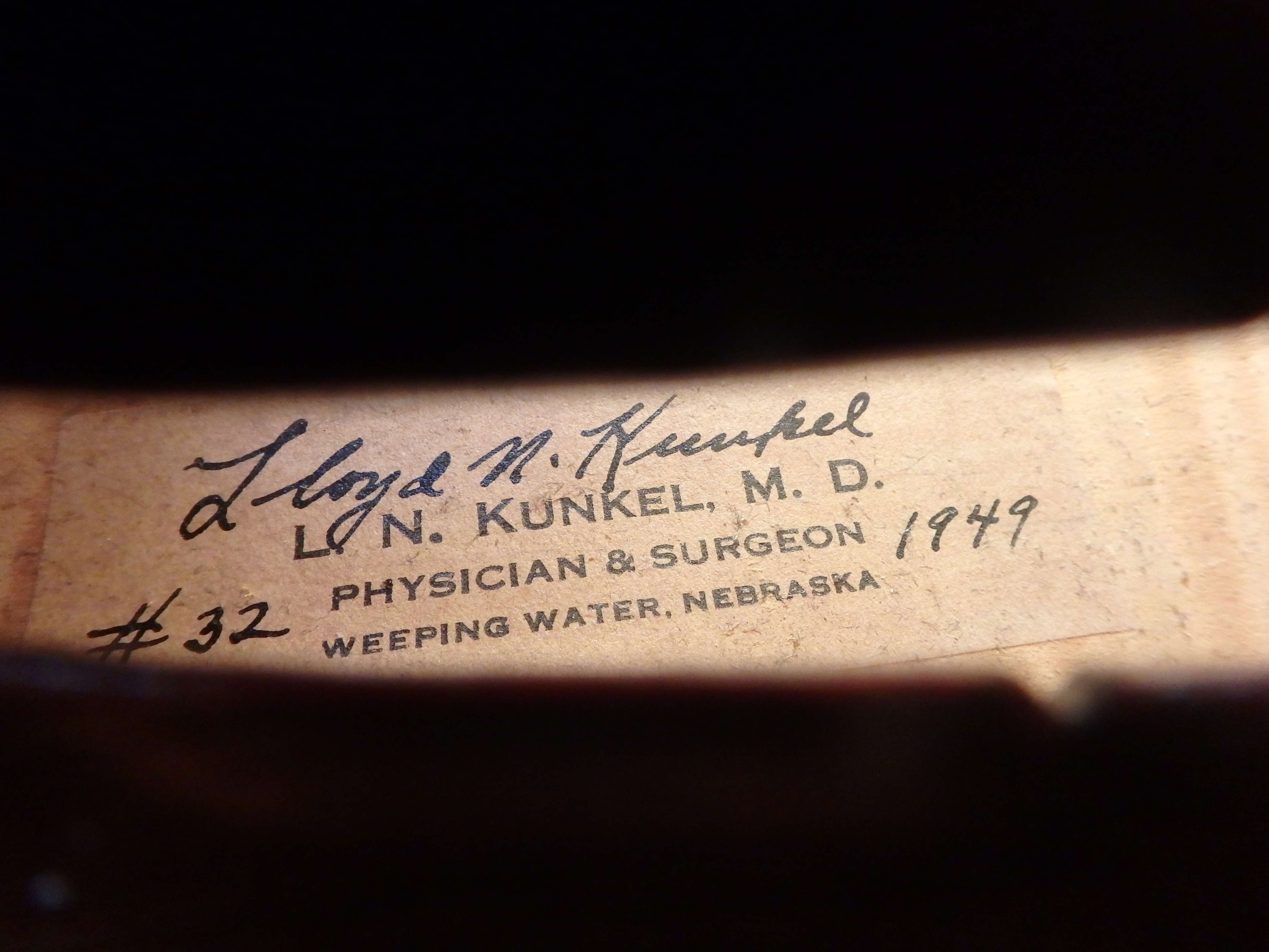 Lloyd Kunkel’s label gives us a beautiful glimpse into the life of an amateur maker who treated his violin making as seriously as his primary career. While serving as a medical officer during World War II, Kunkel spent some of his time stationed in Italy. During his deployment, he rediscovered his boyhood interest in violins and perhaps, while in Italy, was exposed to instruments and instrument makers that inspired him. This violin, dated 1949, would have been among the first that he made upon his return home with his newfound knowledge and inspiration from his time in Europe.