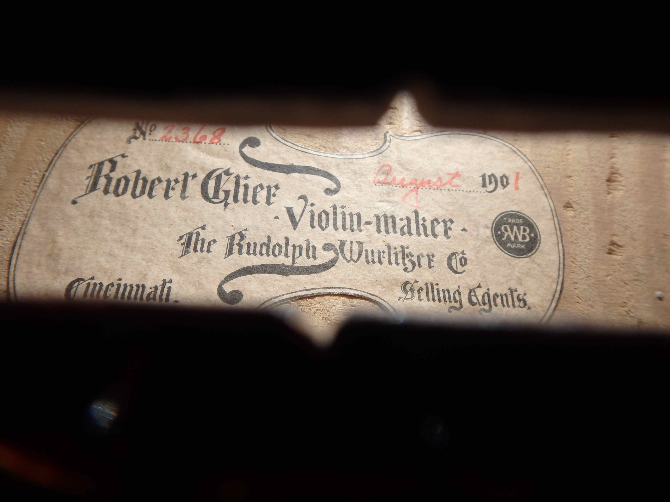 “Robert Glier Violin-Maker The Rudolph Wurlitzer Co. Selling Agents. Cincinnati. August 1901 No. 2368.”