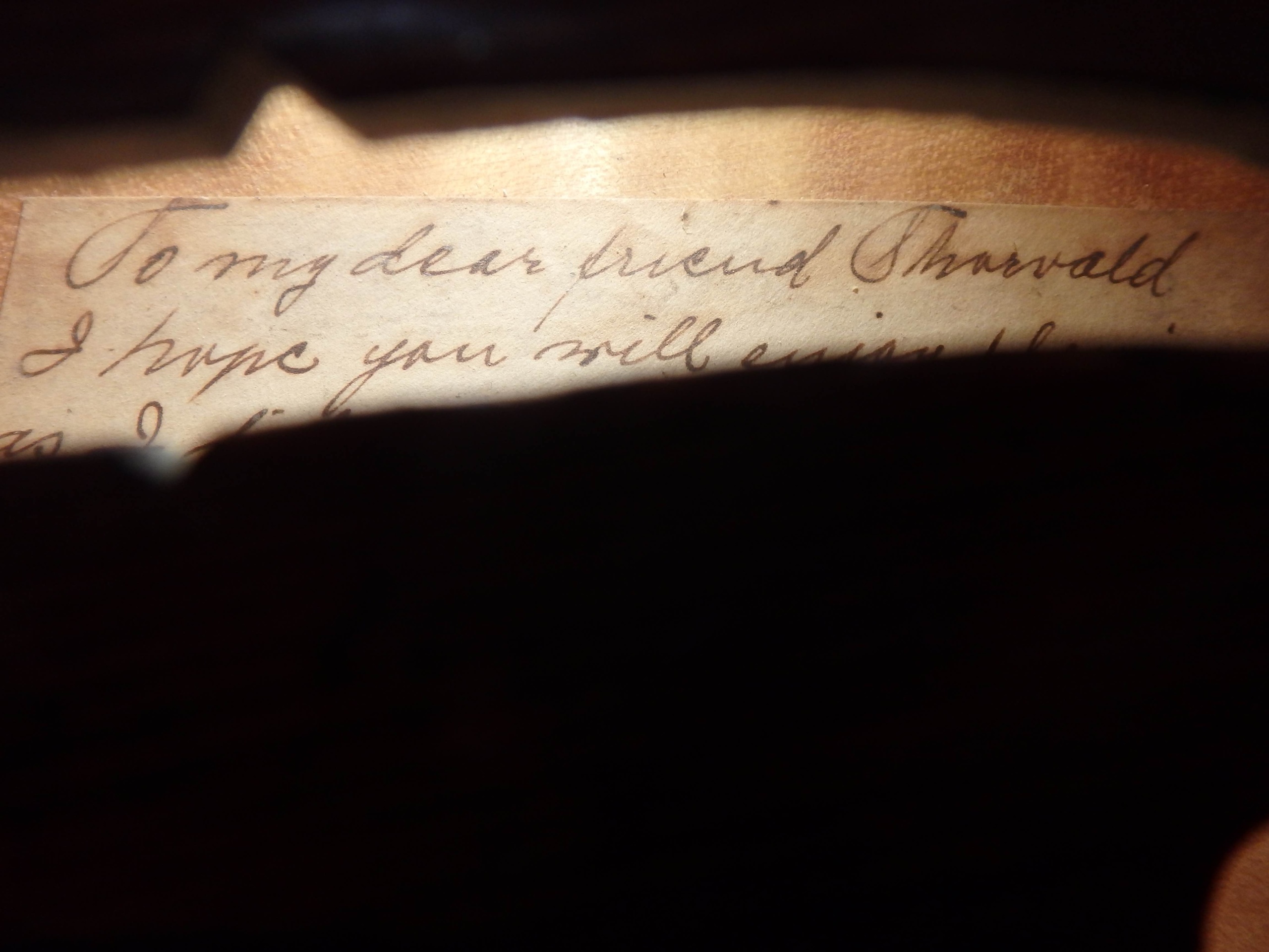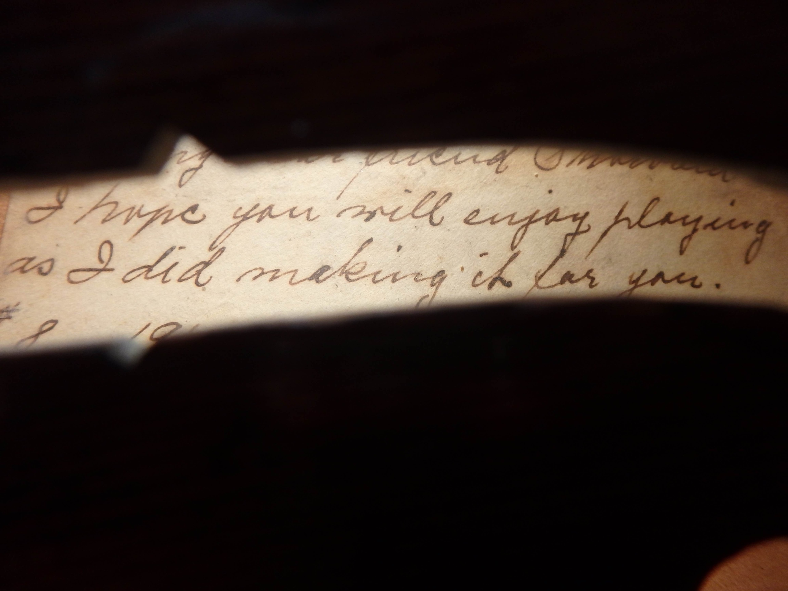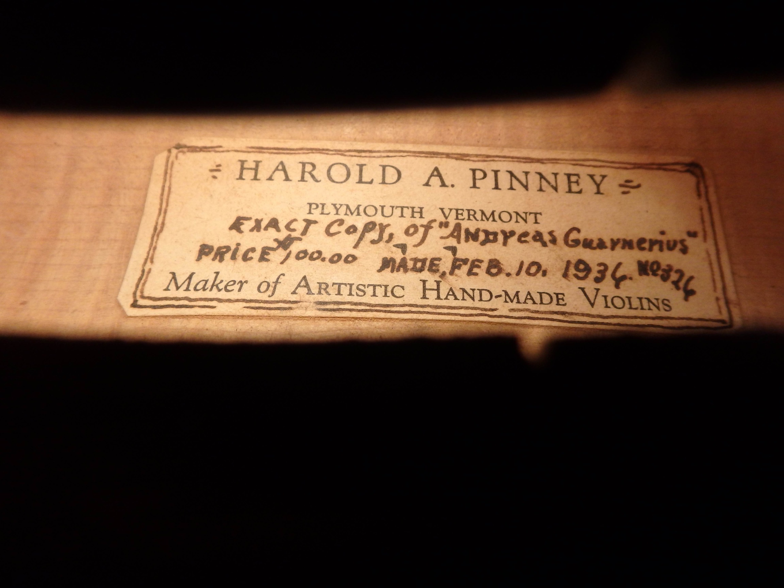“Harold A. Pinney Plymouth, Vermont Maker of Artistic Hand-Made Violins. Exact copy of ‘Andreas Guarnerius’ price $100.00. Made Feb. 10, 1936 No. 326.”