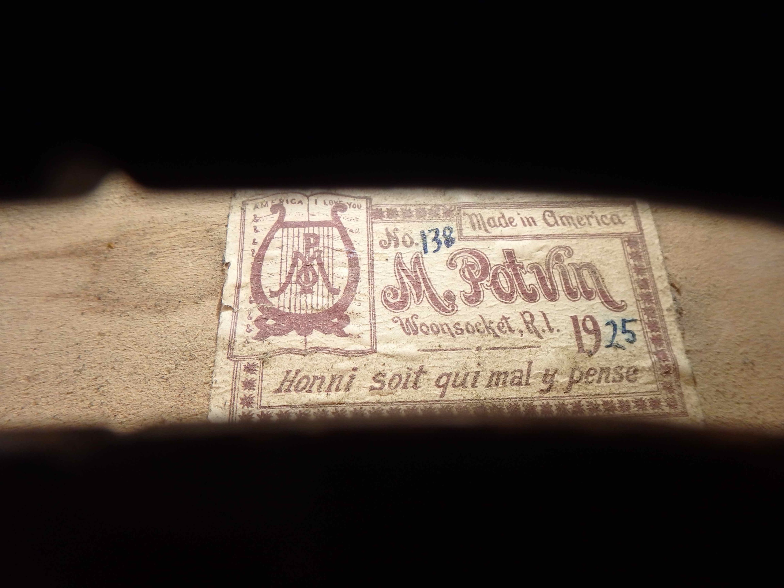 Potvin relocated from Canada to Rhode Island as a teenager and seemed to have developed a love for his new home country. He hammered home his patriotism not only by letting us know the violin was made in America, but also by adding a title to the harp-imprinted sheet music, “America I Love You.” Could it be some sort of reference to the 1915 Archie Gottler tune of the same name? We may never know.