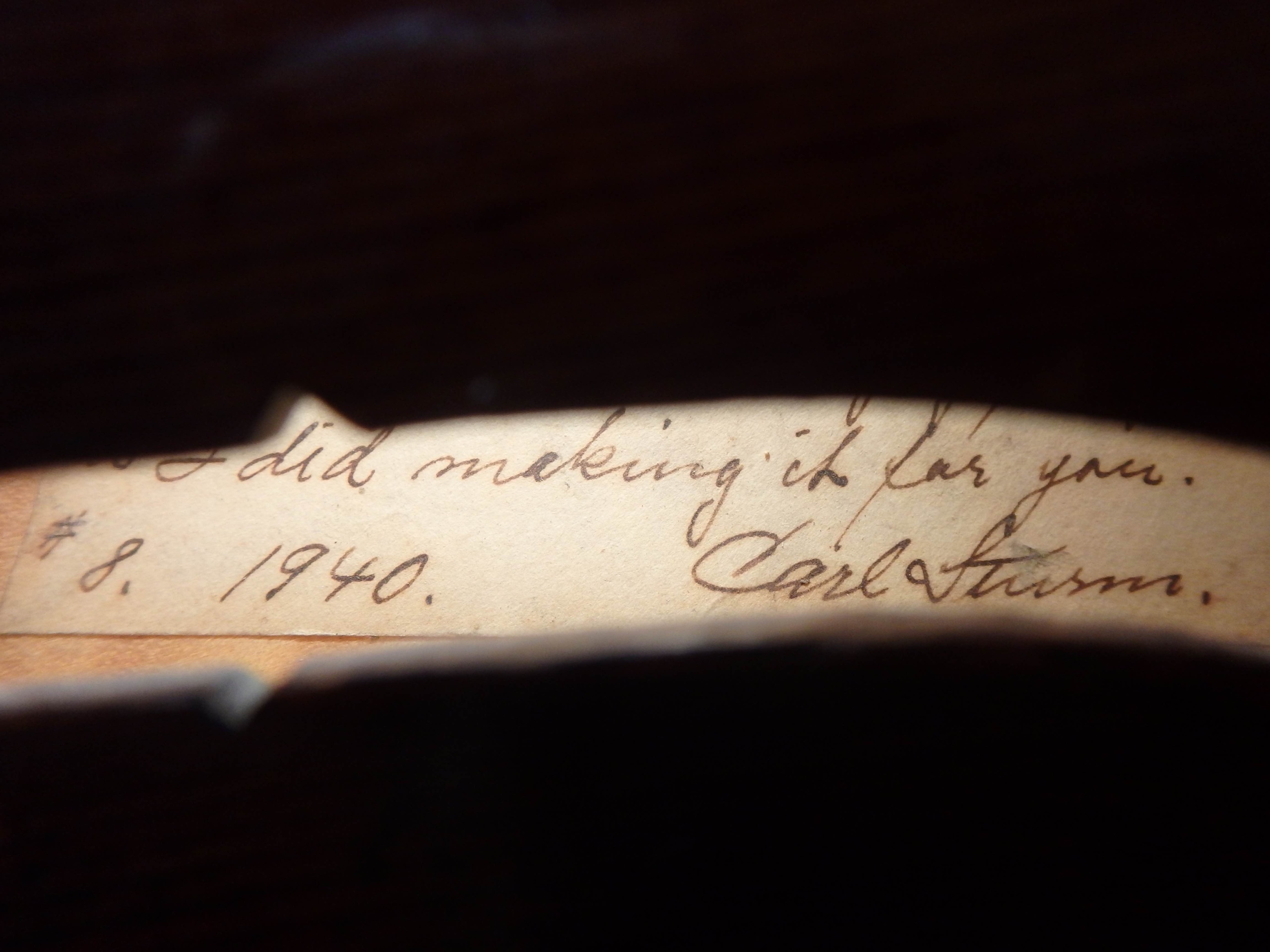 Carl Sturm was active in Chicago in the early 20th century. We know of his viola “#1”, dated 1939 on a printed label. From this we can deduce that his output and operation was quite small, considering only eight violins were made in the 16 years since his start around 1924. I like the idea that Sturm went out of his way to handwrite a label for a violin dedicated to a friend. While we don’t see a bold and flashy label like some of the ones to come, this label offers a wonderful insight into the intentions and dealings of a lesser known maker from 20th century America.